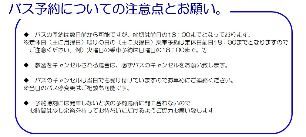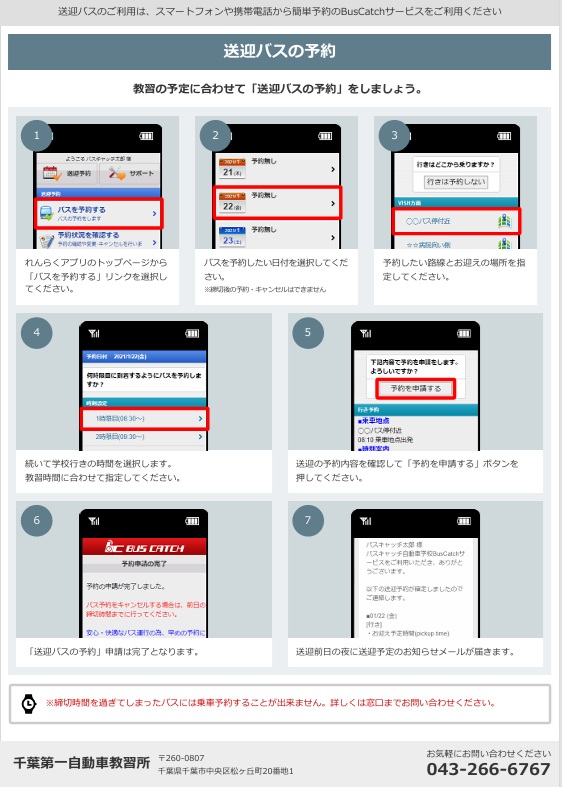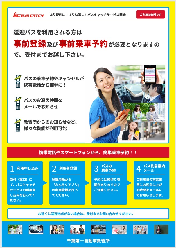 千葉第一自動車教習所では各方面からの公共交通機関以外にも「千葉駅・蘇我駅方面」「おゆみ野・学園前方面」ルートで無料送迎バスを運行しております。 送迎バスのご利用はバスキャッチ・れんらくアプリから簡単にご予約ができます。バスの位置等も確認が出来ますので渋滞遅延時のご不安も防げます。 ◆2025年11月4日より千葉中央駅周辺ルートも増設予定となっております。 詳細は後日ご案内させていただきます。 *送迎バスが近づきましたら*手を上げて乗車の合図をお願い致します。※スマホ、iPhone等集中していてバスを見逃してしまわないようお気をつけてください。 ご利用いただく予約システム・アプリは「バスキャッチ」「れんらくアプリ」になります。当教習所の送迎エリアの確認や到着案内、乗車予約も簡単にできる送迎バス予約サービスです。 無料送迎バスシステムご入所お申込手続き後すぐに利用ができます。 無料送迎バス予約アプリ教習時刻に合わせてバスの乗車予約ができます。到着時刻が近づくとお知らせも届きます。 ご不明な点がございましたらお気軽にお気軽にお問い合わせください。